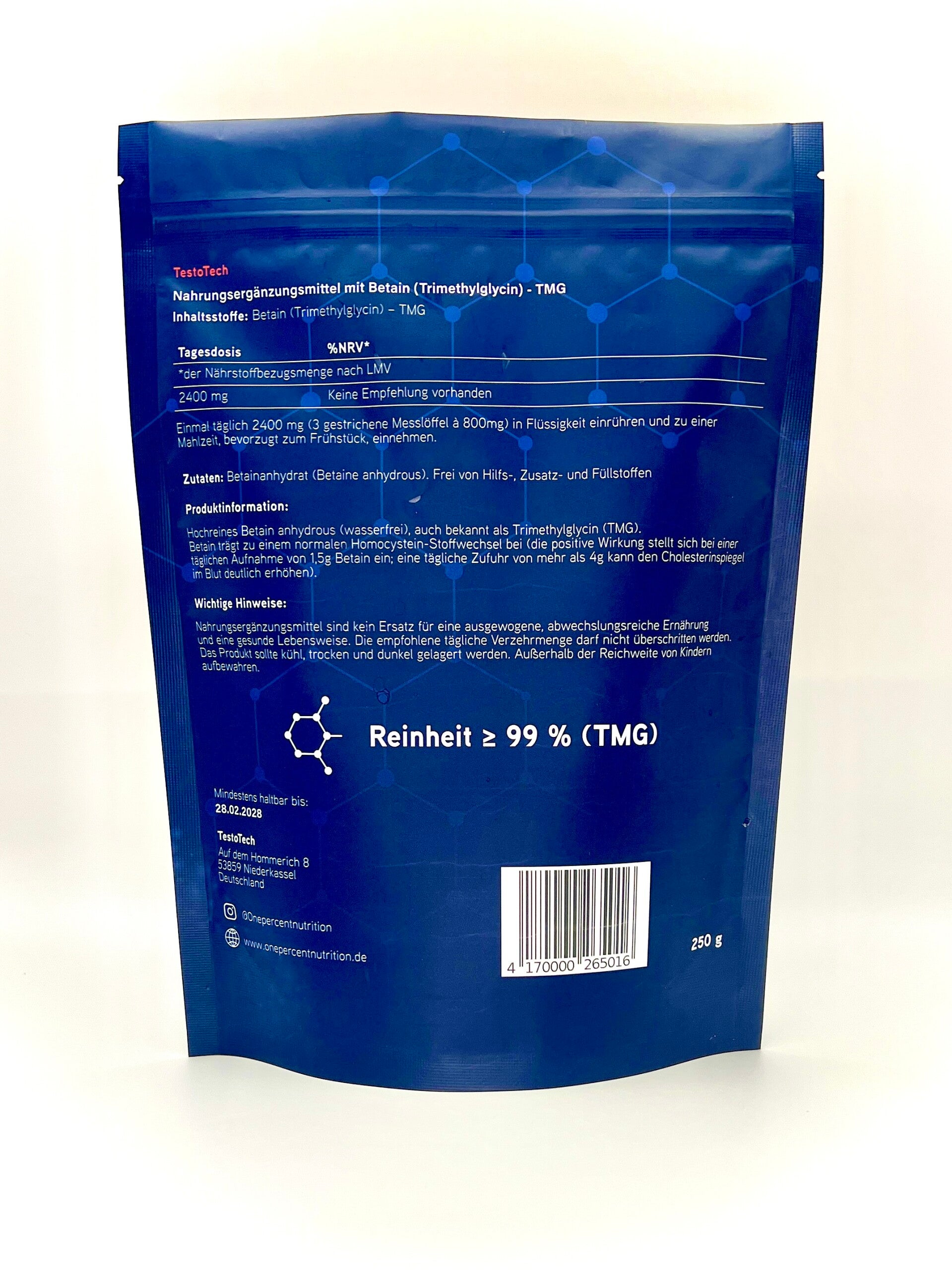 Betain TMG (Trimethylglycin) ist eine natürliche Substanz, die in verschiedenen Lebensmitteln wie Rüben, Spinat und Meeresfrüchten vorkommt. Es wird oft als Nahrungsergänzungsmittel verwendet, weil es den Körper dabei unterstützen kann, den Homocysteinspiegel im Blut zu senken und die Leberfunktion zu verbessern. Zudem kann Betain TMG die sportliche Leistung und die Muskelregeneration fördern.